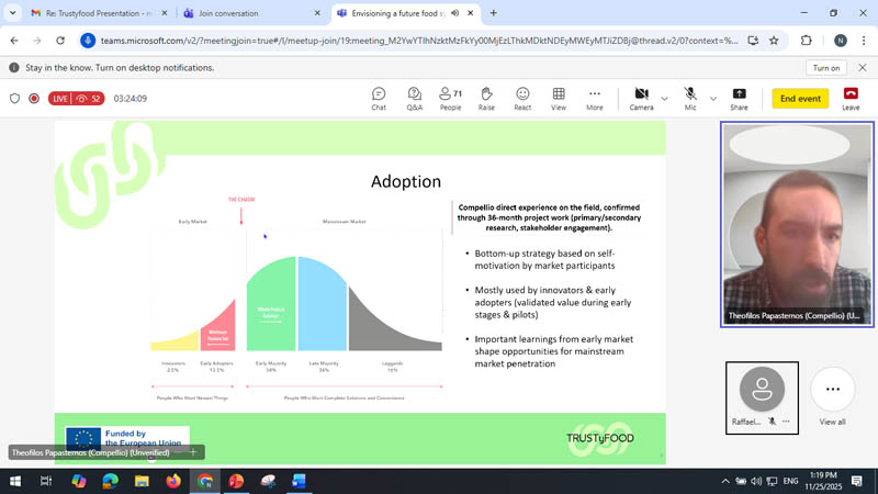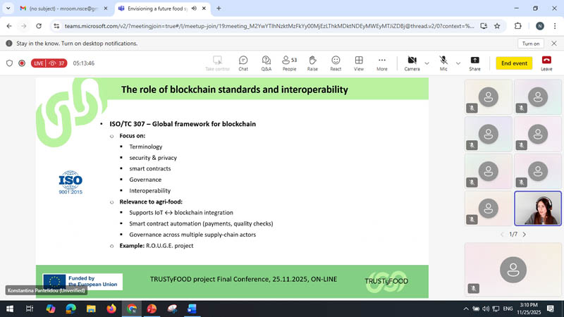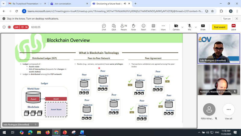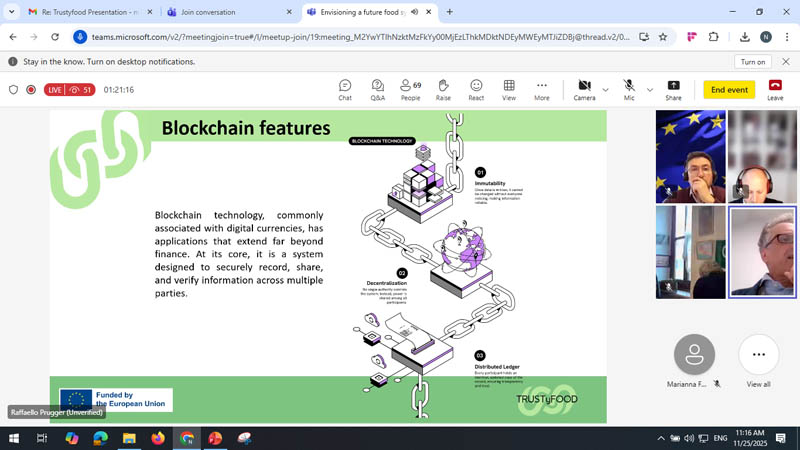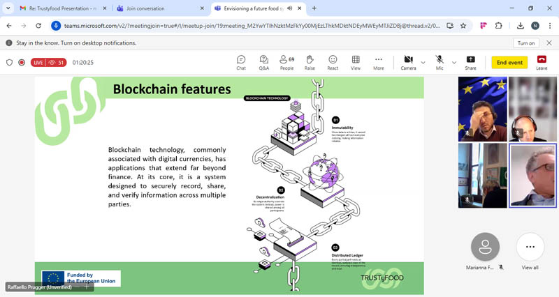 On 25 November 2025, the TRUSTyFOOD project held its online Final Conference, marking the culmination of more than three years of research, experimentation, and international collaboration on the role of blockchain in the agri-food sector. The event, opened at 10:00 by Project Coordinator Raffaello Prugger of Tecnoalimenti S.C.p.A., brought together around one hundred external participants, including researchers, policymakers, institutional representatives, and key stakeholders from across the food system.